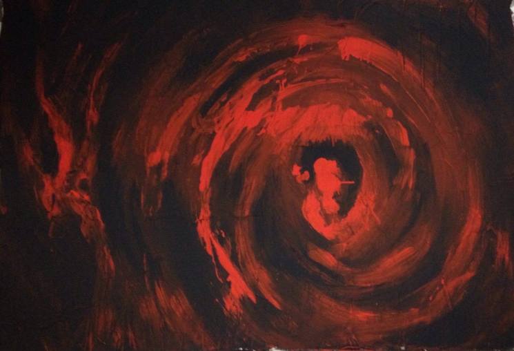La pintura (120 x 80 cm) combina látex, acrílico y papel periódico sobre madera en una composición gestual de tonos rojizos, evocando un vórtice simbólico de tránsito sensorial y espiritual. La pieza dialoga con lo ritual, la percepción expandida y la memoria colectiva desde una mirada introspectiva.
