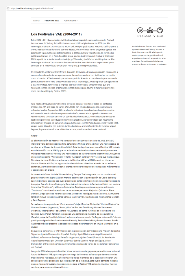 El Festival VAE, organizado por Realidad Visual entre 2004 y 2011 y concebido inicialmente por Alta Tecnología Andina (ATA), fue una plataforma clave para la promoción de las artes electrónicas y mediales en Perú y América Latina. A lo largo de sus ediciones, promovió el diálogo entre artistas locales e internacionales mediante exhibiciones, instalaciones, talleres y conciertos, descentralizando la actividad cultural al extenderse por diversas regiones del país.