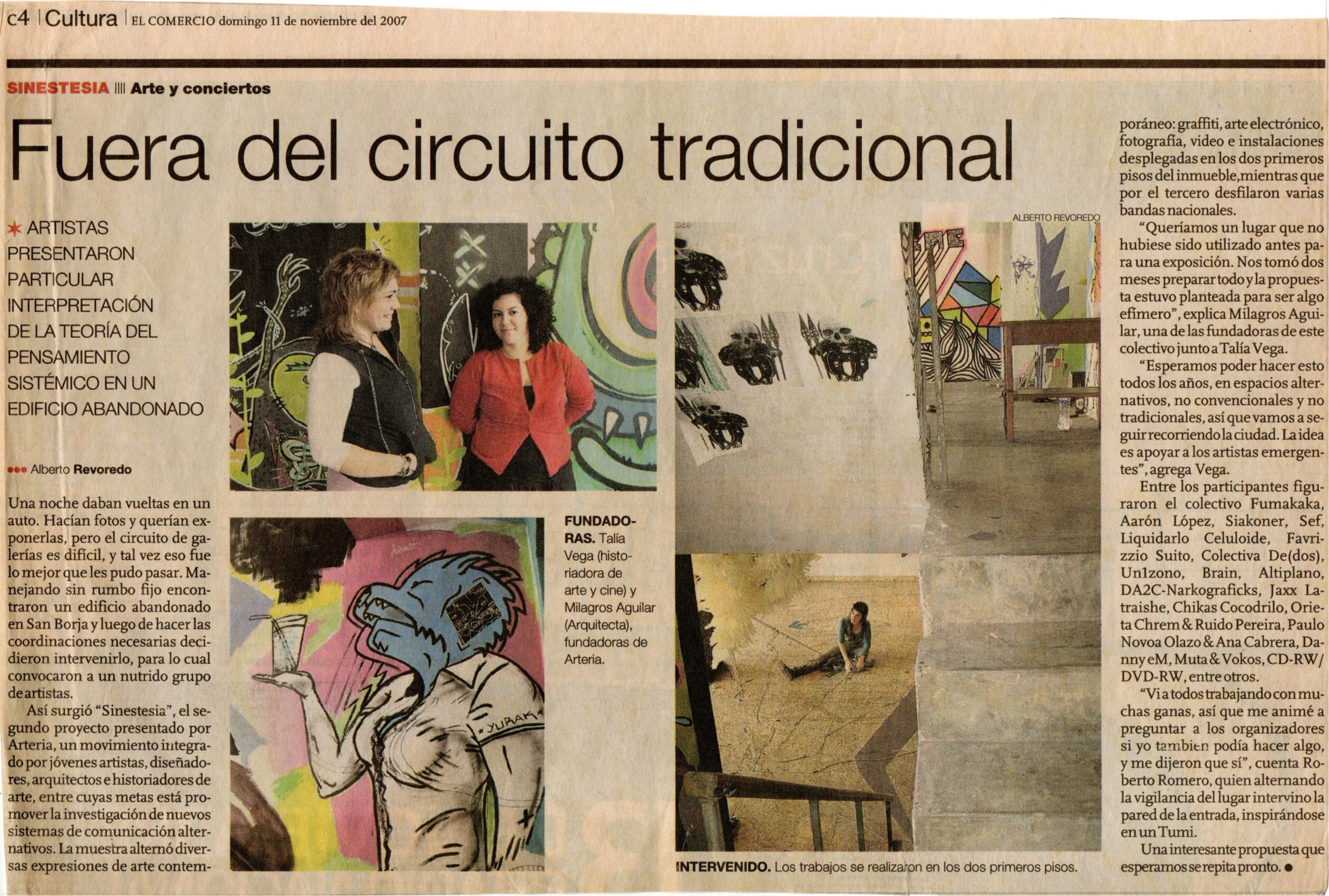 Nota publicada en El Comercio (2007) sobre la exposición colectiva organizada por Arteria. La muestra visibilizó propuestas emergentes, críticas y experimentales fuera del circuito de galerías convencional.