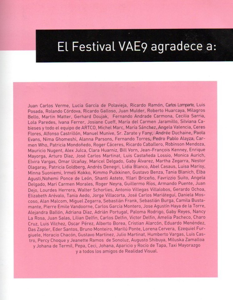 El Festival Internacional de Video/Arte/Electrónica (VAE), organizado por Realidad Visual entre 2004 y 2011, fue una plataforma clave para la promoción y producción de artes mediales en Perú. Concebido originalmente por Alta Tecnología Andina (ATA) en 1998, el festival se consolidó como un espacio de referencia en el ámbito del arte electrónico y audiovisual en América Latina. A lo largo de sus ediciones, VAE presentó una amplia gama de exposiciones, instalaciones, conciertos y talleres, fomentando el diálogo entre artistas locales e internacionales y promoviendo la descentralización cultural al llevar actividades a diversas regiones del país.